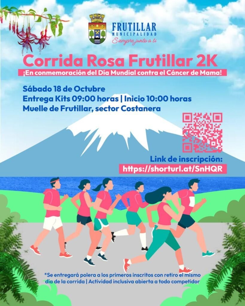 La Municipalidad de Frutillar, con su lema «Siempre junto a ti», invita a toda la comunidad a participar en la Corrida Rosa Frutillar 2K, un significativo evento en conmemoración del Día Mundial contra el Cáncer de Mama. Esta actividad busca generar conciencia y promover la importancia de la prevención en la lucha contra esta enfermedad.