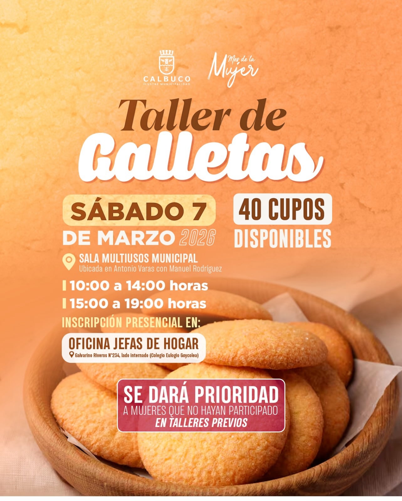 Calbuco celebra el Mes de la Mujer 2026 con talleres gratuitos de galletas y jabones el 7 y 8 de marzo. Inscripciones presenciales.