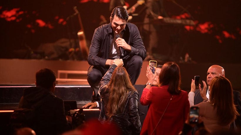 El tenor italiano descendió del escenario para compartir directamente con el público, cantando junto a sus fans, un gesto que generó un notable entusiasmo entre los asistentes durante su actuación.