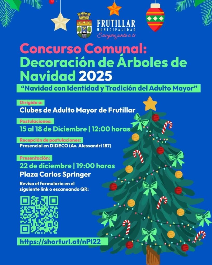 El concurso “Navidad con Identidad y Tradición del Adulto Mayor” invita a los Clubes de Adulto Mayor de Frutillar a decorar árboles de Navidad con un espíritu creativo y lleno de historia. 🌟