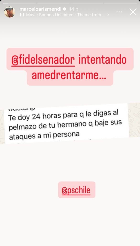 Marcelo Arismendi utilizó sus redes sociales para exponer directamente al senador Espinoza. En una publicación que rápidamente se viralizó, Arismendi compartió una captura de pantalla de un mensaje intimidatorio enviado desde la cuenta @fidelsenador. El texto, dirigido a un hermano de Arismendi, decía textualmente: "Te doy 24 horas para q le digas al pelmazo de tu hermano q baje sus ataques a mi persona", etiquetando además a @pschile.