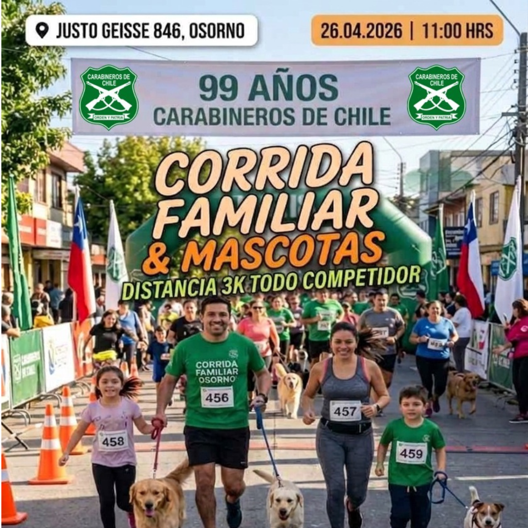Carabineros de Chile, a través de la Prefectura de Osorno N°24, está invitando a toda la comunidad a participar en la "Corrida Familiar & Mascotas". Este evento gratuito, que se realizará el próximo domingo 26 de abril, busca celebrar los 99 años de la institución, reuniendo a las familias y sus mascotas en una jornada de deporte, entretención y sorpresas en la ciudad de Osorno, en el corazón de nuestra región.