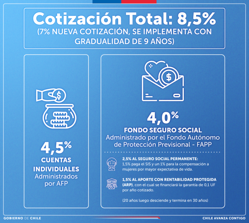 - 0,1% a cuentas individuales de AFP: Una pequeña parte de este porcentaje se destinará directamente a las cuentas de capitalización individual de las AFP, contribuyendo a incrementar el ahorro previsional de cada trabajador. Esto fortalece el componente individual de las pensiones.