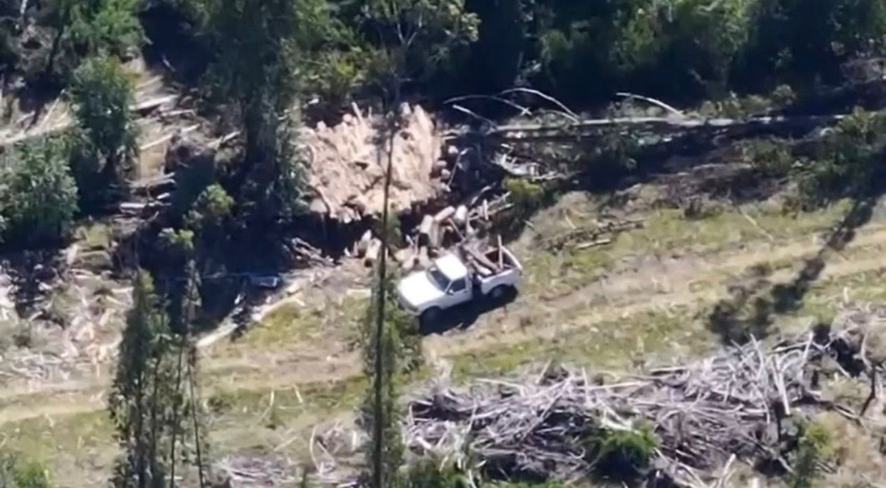 La PDI detuvo a cinco hombres en el predio El Pastor tras ser sorprendidos realizando talas ilegales. Se incautaron camionetas y maquinaria.