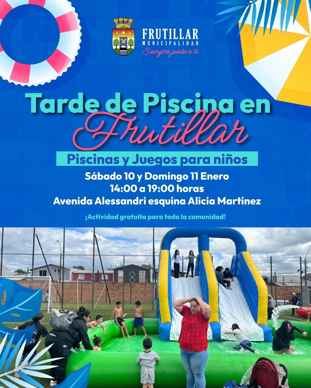 ¡Frutillar te invita a disfrutar del último día de diversión acuática! 🌞 La Municipalidad ha organizado la "Tarde de Piscina" gratuita para que niños y familias disfruten del verano. Este domingo 11 de enero, desde las 14:00 hasta las 19:00 horas, la Av. Alessandri esquina Alicia Martínez, sector Pantanosa, será el epicentro de la alegría y el frescor. 🎉